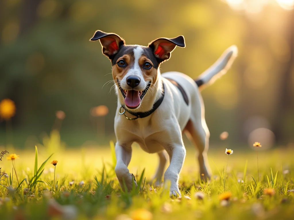 Um cão animado com a língua para fora, correndo em um parque ensolarado.