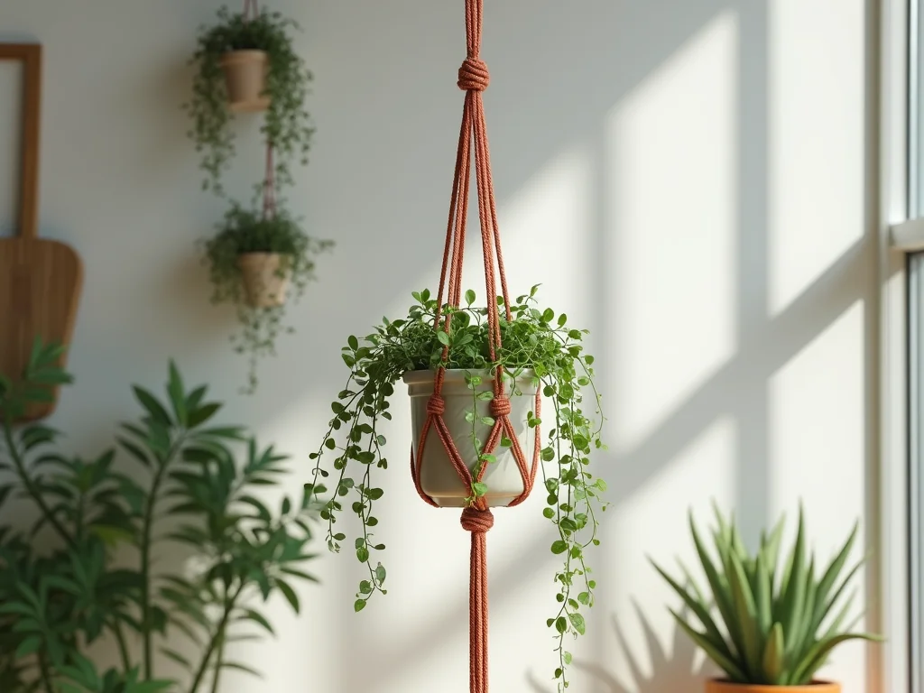 Um suporte de macramê branco com nós espirais firmes, complementando um vaso de plantas com folhagem exuberante em um cômodo minimalista.
