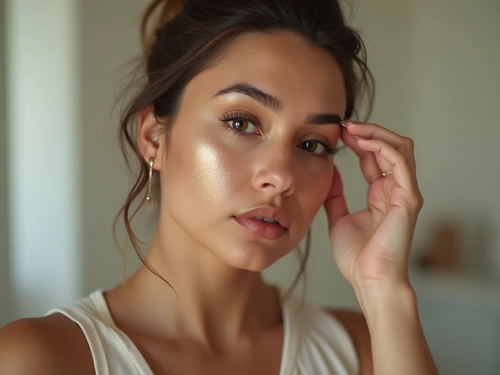 Pele do rosto com maquiagem leve e iluminada, destacando o contorno das maçãs do rosto e o brilho sutil na testa.