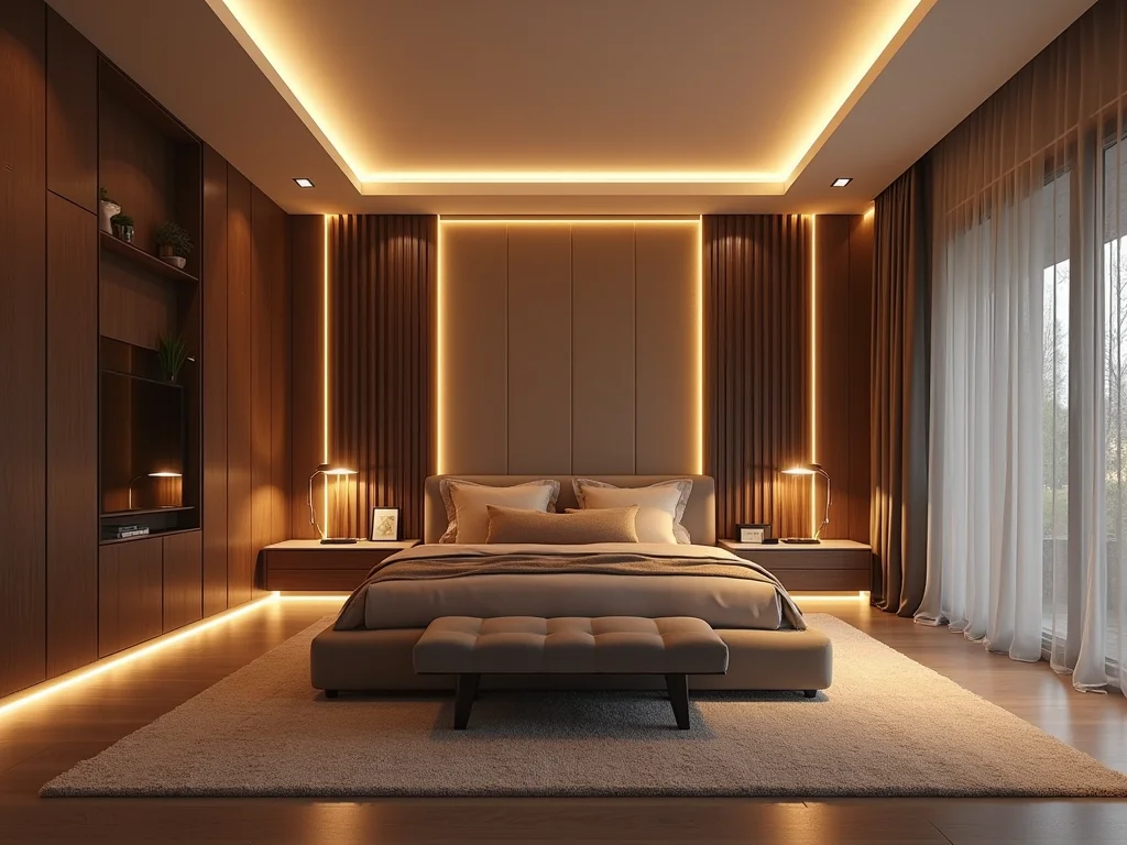 Quarto de casal com iluminação indireta em LED no teto e luz de leitura direcionada na cabeceira.