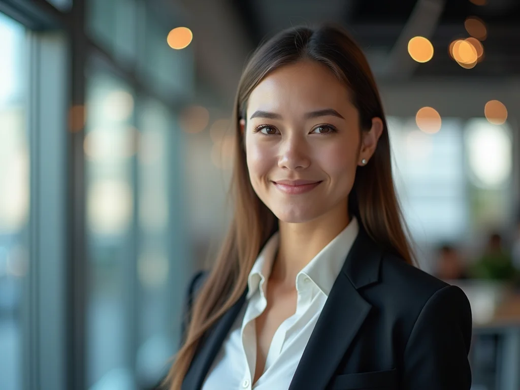 - Expressão: Sorriso leve e olhar direto para a câmera, transmitindo abertura.