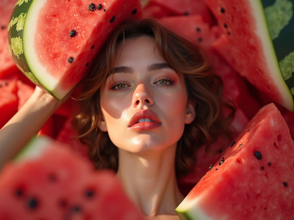 Close-up do rosto da Mulher Melancia com um filtro de beleza sutil, em um ambiente com luz natural suave vinda de uma cortina branca translúcida.