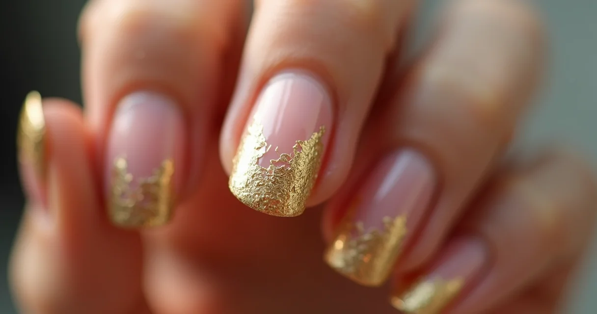 Close-up de unha com esmalte nude fosco e delicados fragmentos de folha de ouro aplicados de forma irregular na área da cutícula, com iluminação suave.