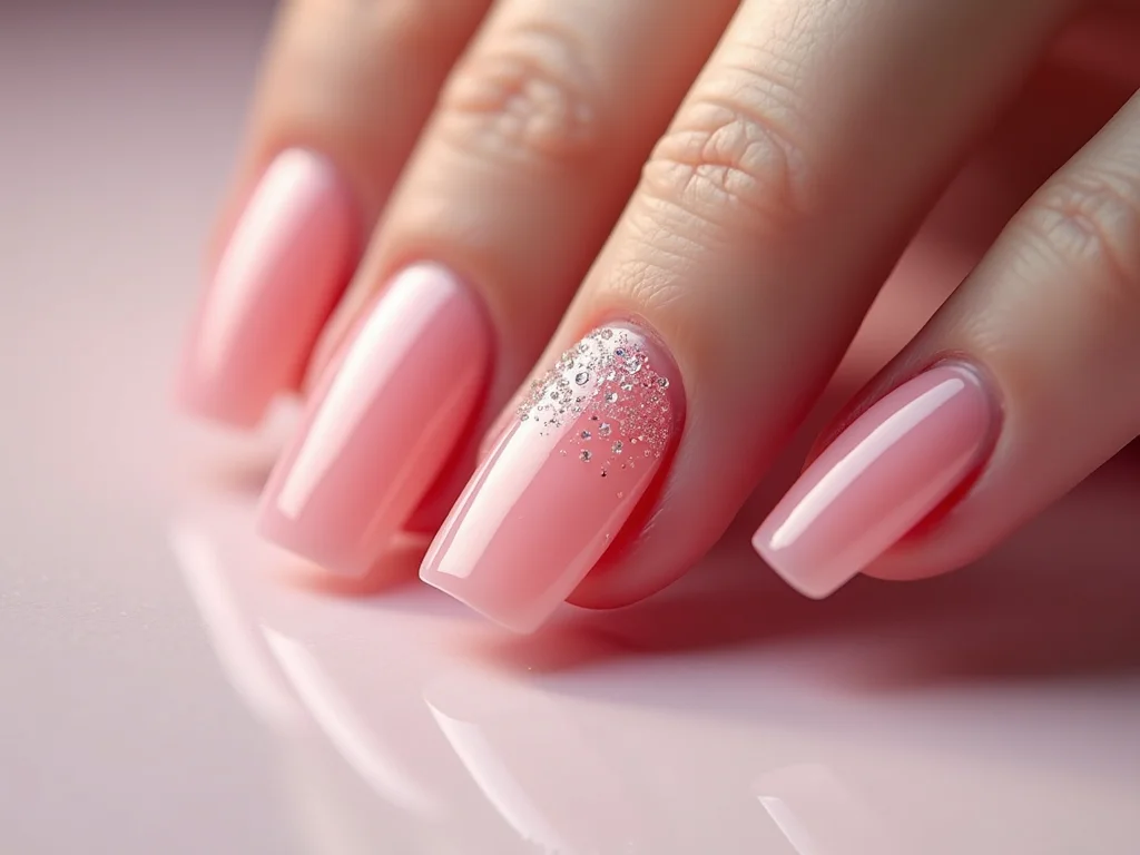 Detalhe de unha em gel rosa bebê com glitter prata em flocos, aplicado em degradê sutil na ponta, com foco na textura lisa do gel.